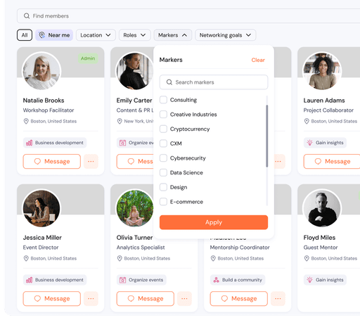 Activate organic conversations, meaningful matches, and automated follow-ups across your entire community.