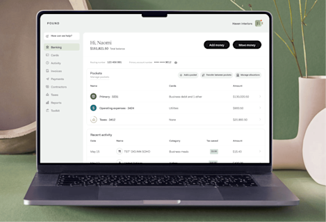Found is your entire back office, consolidated into one, seamless platform. Get paid, send payments, manage your cash flow, and stay ahead of tax season—right where you bank.