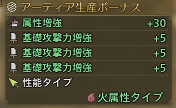 アーティア片手剣の生産ボーナスは、「基礎攻撃力増強」がおすすめです。片手剣は手数が多いため属性が強い武器ですが、現時点だと攻撃力を伸ばすほうが火力が高いため、基礎攻撃力を上げていきましょう。