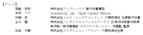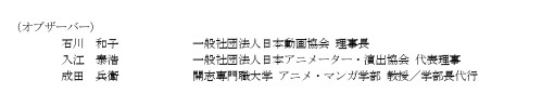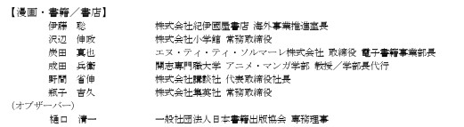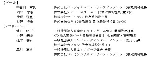 (以上①ゲーム/②アニメ/③漫画・書籍/⑤音楽/⑥映画・映像の5分野の委員、その他分野の代表者は省略)
