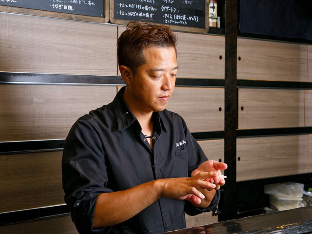 1981年、愛知県生まれ。16歳からアルバイトとして寿司店で働くようになり、そのままその寿司店で修業。18歳で早くも寿司を握ることに。店の先輩やお客さんに鍛えられながら腕を磨く。その後大バコの懐石料理の店で修業を続けていたが、「しっかりお客さんの顔を見て仕事がしたい」という思いから独立、カウンターがメインのこの店をオープンさせた。
