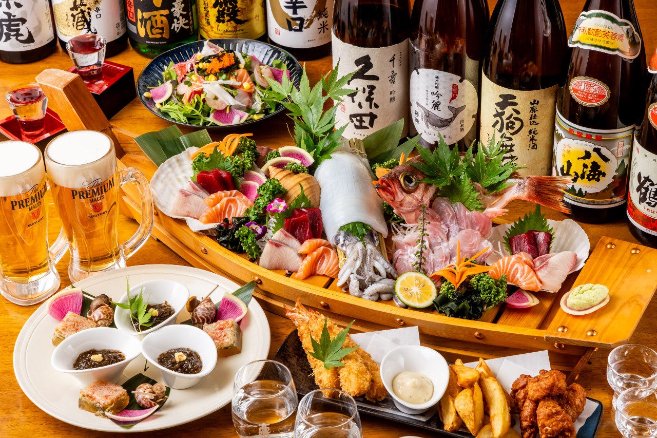 目利きの職人が毎日市場で厳選した海鮮やブランド肉、旬菜をお楽しみください。 ■ご宴会コース■ ★大好評の幹事様に嬉しいクーポンをご用意! (1)【幹事特典】10名様以上コース予約で『獺祭スパークリング』1本無料サービス!or 10名様以上でのご利用で幹事1名様無料!(※6,090コース限定) (2)【誕生日や記念日に】10名様以上のコースご予約で特製メッセージプレート無料! ■お飲み物■ 全国各地選りすぐりの日本酒は必見。 お得な単品プレミアム飲み放題は期間限定1,000円OFFで2,980円⇒1,980円! ■店内■ 周りを気にすることなくお食事を満喫できる個室を完備。 店内は全席喫煙可能なため、ご宴会/接待/歓送迎会など幅広いシーンでご利用いただけます。