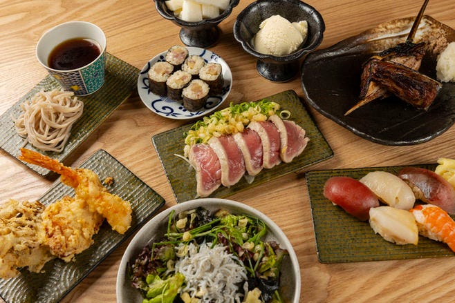 = 寿司と天ぷらにこだわるおしゃれな和食居酒屋 = 寿司は【豊洲直送の鮮魚】にこだわり、 リーズナブルな価格でご提供。 天ぷらは【国産牛・新鮮野菜】などを使用した カラッと揚げた軽い食感をお楽しみいただけます! ■季節の宴会・接待・会食・記念日におすすめ ◎2時間飲み放題付コース:10品5,500円~ ◎単品飲み放題:生ビール含む約30品2,200円 ■ドリンク70種以上 -寿司・天ぷらと楽しむ- 生ビール・日本酒・焼酎・ワインの他、 《知多・白州・山崎・響・碧》などの ジャパニーズウイスキーもご用意。 お茶はすべて茶葉からお店で落としており、 香りの高さをお楽しみいただけます。 ■木の温かみ溢れるおしゃれな店内 〈座席〉カウンター・テーブル席・完全個室 〈個室詳細〉2~8名様迄利用可能 ※コースor単品飲み放題利用のお客様限定