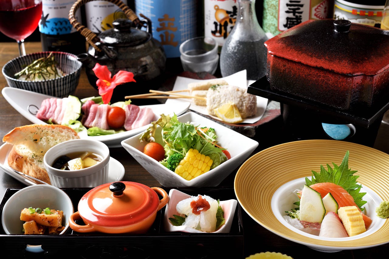 お客様の8割が注文する種類豊富な130種飲み放題(単品利用OK) 鮮度抜群の刺身、熊本直送の馬刺し、A5飛騨牛など 個室2名~人数に応じて。接待などビジネスから宴会も