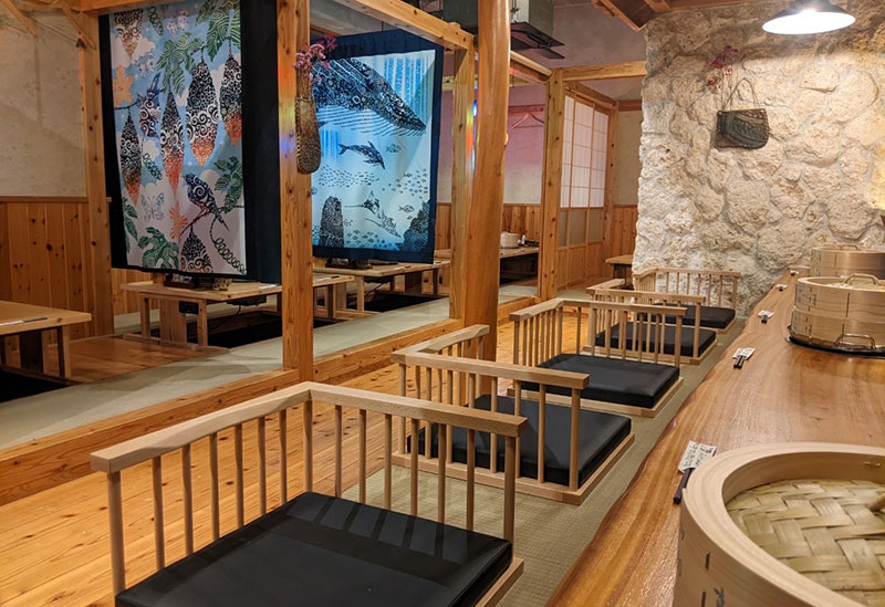 海近く、宜野座インターを下りてすぐに位置する【島しゃぶ屋豚とん拍子】。やんばる島豚に精通したオーナーの仲嶺さんが提供する、やんばる島豚のしゃぶしゃぶやすき焼き、沖縄料理が楽しめるお店です。しゃぶしゃぶは「スーチカー」と呼ばれる豚肉を塩漬けにした熟成肉や、アグー豚を昆布や鰹のだしにくぐらせ、自家製のシークァーサーぽん酢や海ぶどうと共にいただきます。店内には沖縄の作家がつくった伝統工芸品の装飾や、水中を映し出したスクリーン、沖縄民謡のBGMと、ムード満点です。海好きの仲嶺さんと、ダイビングスポットやシークレットポイントの話に花を咲かせるなど、沖縄と海が好きな人にはぜひ訪れてほしいお店です。