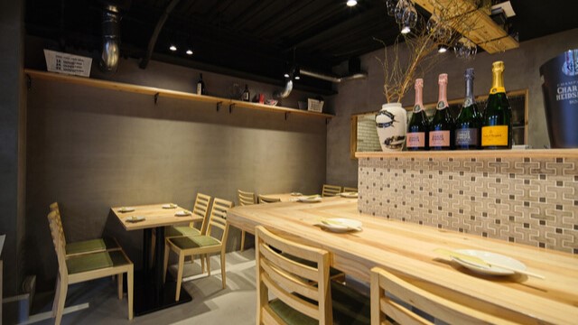明治通り沿いのマンション1F、少し奥まった場所に佇む カウンター8席の日本酒バー。 日本酒や木の薫りに包まれる空間には、壁面の冷蔵庫にも 頭上の棚にも一升瓶がびっしりと並び、その数は500本以上。 店主きたぽんこと北尾秀仁氏がそれぞれの絶妙な飲み頃を見極め、 燗をつけて提供する日本酒と それに合う、スパイス・ハーブ・発酵・薬膳を多用し、 和食をベースとした創作料理をお楽しみいただきます。 スペシャリテは、熟成の旨味がのった生ハムの盛り合わせ。 極限まで生ハムを薄くスライスできる特殊なスライサーにて、 生ハムが口内で溶け濃醇な旨味が広がる中に 熟成酒のお燗を飲むという口内調味もご堪能いただけます。 一点物の酒器なども多く揃え、多彩な器使いも楽しい時間。 吉野杉の天板カウンター席で愉しむ、心地よいひとときをお楽しみ下さい。