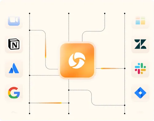 Central orange app icon connected by dotted lines to various app logos including Google, Slack, Jira, Microsoft, and Notion on a light background.