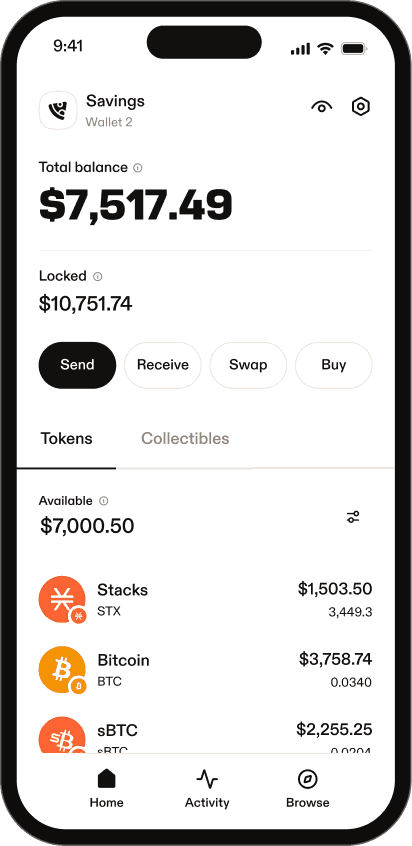 See all your Bitcoin, tokens, and collectibles at a glance, designed for clarity and a clean visual experience.