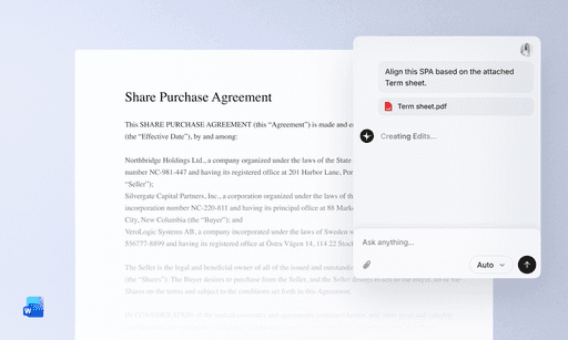 Compare the Term Sheet with the Share Purchase Agreement to ensure alignment, identify missing, modified, or expanded terms, and flag discrepancies. Then, quickly draft the SHA and MIP documents using the Word add-in based on these findings.