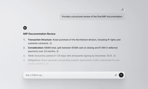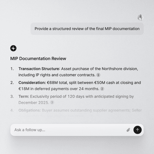 Review the final MIP documentation, summarize key terms, flag any unusual or complex clauses, and confidently base your decisions on the due diligence report.