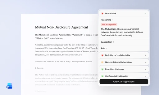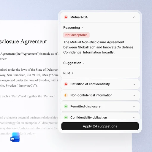 Use the Word Add-in to review NDAs against firm playbooks, draft engagement letters, summarize key documents, and create a letter of intent in minutes—not hours.