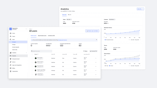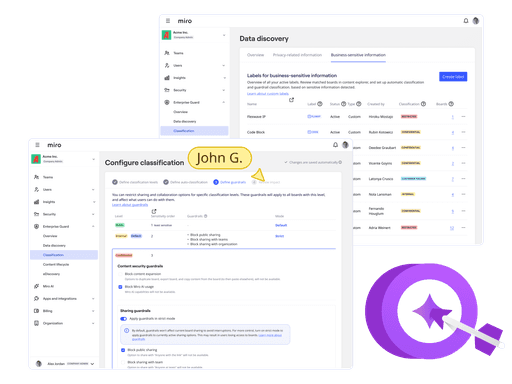 Miro Enterprise Guard añade una capa avanzada de seguridad y gobernanza. Identifica y protege automáticamente contenido sensible, gestiona los ciclos de vida del contenido y respalda el descubrimiento y retención legales.