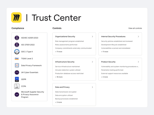 Seguimos las mejores prácticas de la industria y los requisitos regulatorios, incluyendo ISO/IEC 27001, NIST, SOC2 Tipo II, SOC3 y TISAX.